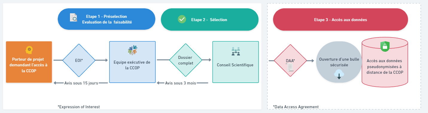 Les équipes de recherche voulant accéder aux données disponibles dans la Plateforme CCOP doivent tout d’abord soumettre un formulaire EOI (Expression of Interest) à l’équipe exécutive de la CCOP () dans le cadre d’appels à projet (AAP).